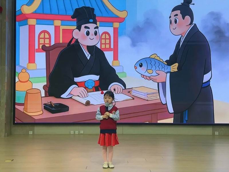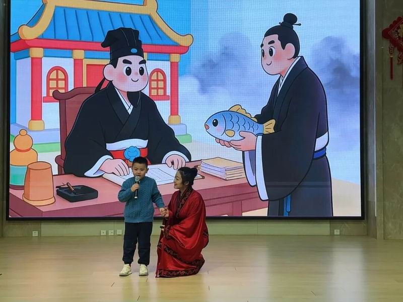 该课程结合幼儿学习特点,以趣味猜谜开场,借助小鱼玩偶、视频为孩子们讲述了“羊续悬鱼”这一汉代廉政故事。孩子们化身“小小故事员”,生动演绎了羊续悬鱼明志、清廉拒礼的典故。在情景互动环节,幼儿通过角色扮演学习如何礼貌拒绝不应接受的物品,在体验中将“知礼向善”的价值观内化于心。