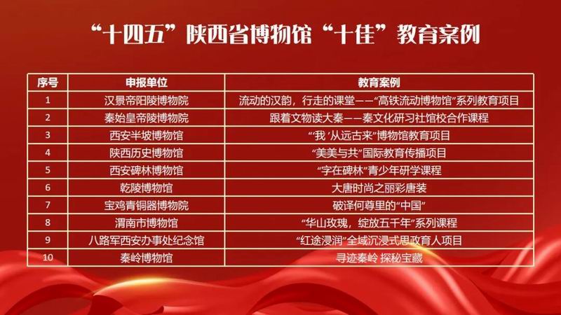2月5日,由陕西省文物局指导,陕西省博物馆协会主办,陕西省博物馆协会社会教育专业委员会承办,汉景帝阳陵博物院协办的“十四五”陕西省博物馆十佳教育案例推介活动终评会在汉景帝阳陵博物院召开,共评选出十佳教育案例和三个单项奖。