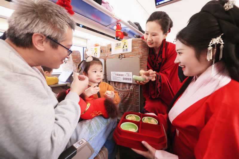互动环节中,教育员现场讲述“彩绘骑马俑”的文物故事,并组织旅客学习编织吉祥结、平安结,搭配小马挂坠制作结饰,将美好祈愿系于绳间;带领旅客探秘汉代太初历,手绘马年台历并标注汉代节日;循汉代礼仪共享“马蹄酥”特色糕点,在味蕾体验中感受古礼文化。此外,汉代舞蹈《马踏飞燕》、魔术《踏花归去》、蒙古族舞蹈《快马逐风》等节目也都年味十足,为旅途增添欢乐氛围。