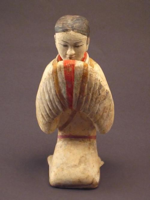 考古学家给她起了一个很专业的名字,叫做“塑衣式拱手跽坐女俑”。她长眉细目,鼻梁纤巧,表情自然而略显羞涩,身着彩衣,以拱手的姿态半遮面部。说她是美女,一点儿都不夸张。除了面容秀美之外,她头发中分,发髻绾于颈后,又分出一缕自然下垂,使人顿生飘逸脱俗之感。汉代女性的柔美、端庄无不体现在她的眉宇之间。