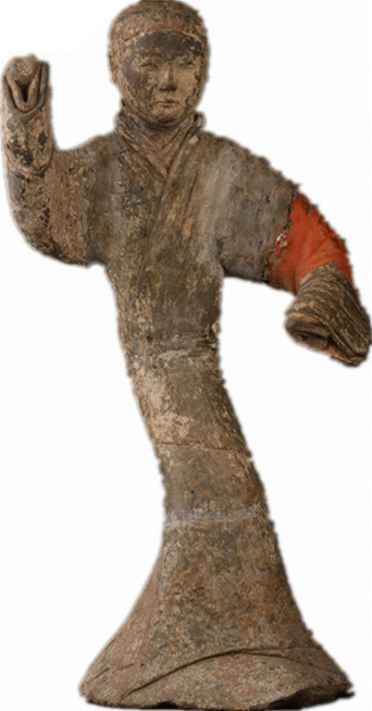 她身材高挑,双膝微曲站立,右臂上扬,左臂向内自然弯曲,动作舒缓而典雅。苗条的身材,曼妙的舞姿,仿佛正随着音乐节拍舞动,静态的形象中蕴含了丰富的动态美。透过她,我们仿佛看到了西汉美女赵飞燕掌上起舞的风采,同时也感受到她苦练歌舞的坚韧和对技艺的执着,这应该也是一种艺术领域的“工匠精神”吧。