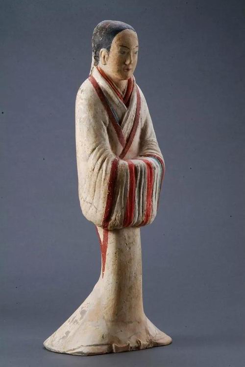 她屈膝、含胸,双手拢于宽大的袖筒内,端庄肃穆,这种站姿是汉代宫廷里宫女“肃立”的形象。据西汉贾谊的《新书》记载,最正规的站姿叫做“经立”,经立时,要挺胸抬头,臂如抱鼓,这种站姿便于在重要场合行礼叩拜。在她身上,我们仿佛能看到汉代女性雍容娴静、沉稳庄重的仪态和神韵。