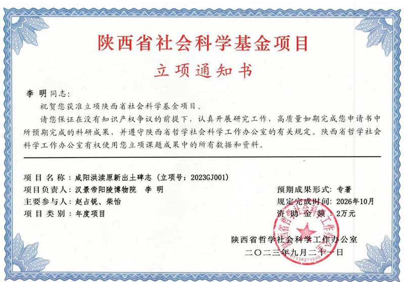 近期,汉景帝阳陵博物院“咸阳洪渎原新出土墓志”“陕西馆藏汉代京畿地区出土汉代服饰文物的考古学观察”两项科研课题分别入选陕西省社会科学基金项目和陕西省哲学社会科学研究专项。