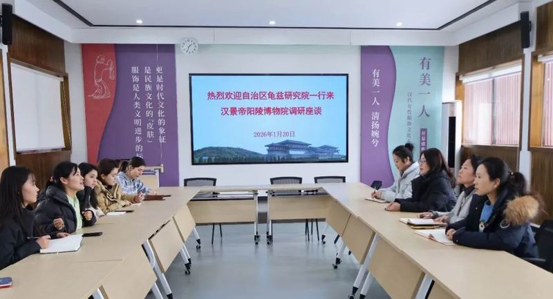1月20日,新疆维吾尔自治区龟兹研究院宣教科同行一行六人来汉景帝阳陵博物院进行调研座谈,汉阳陵社教部主任及讲解员代表参加。